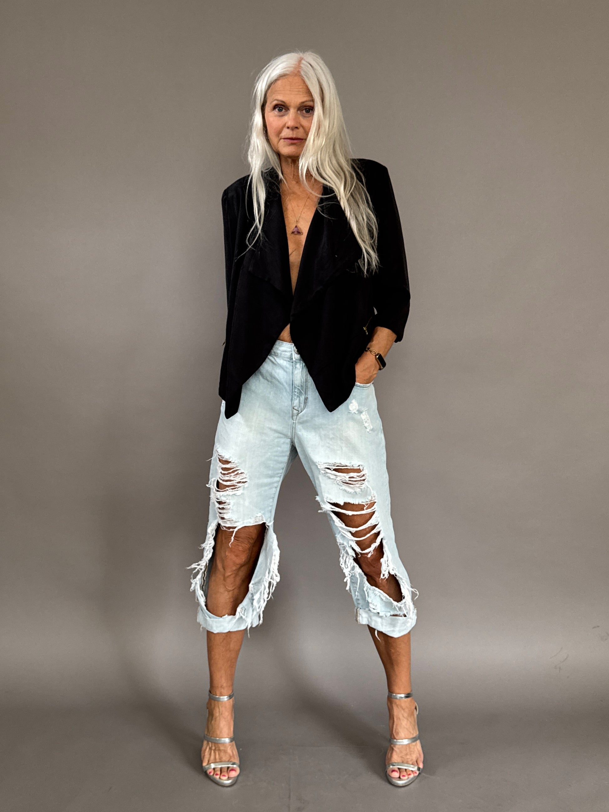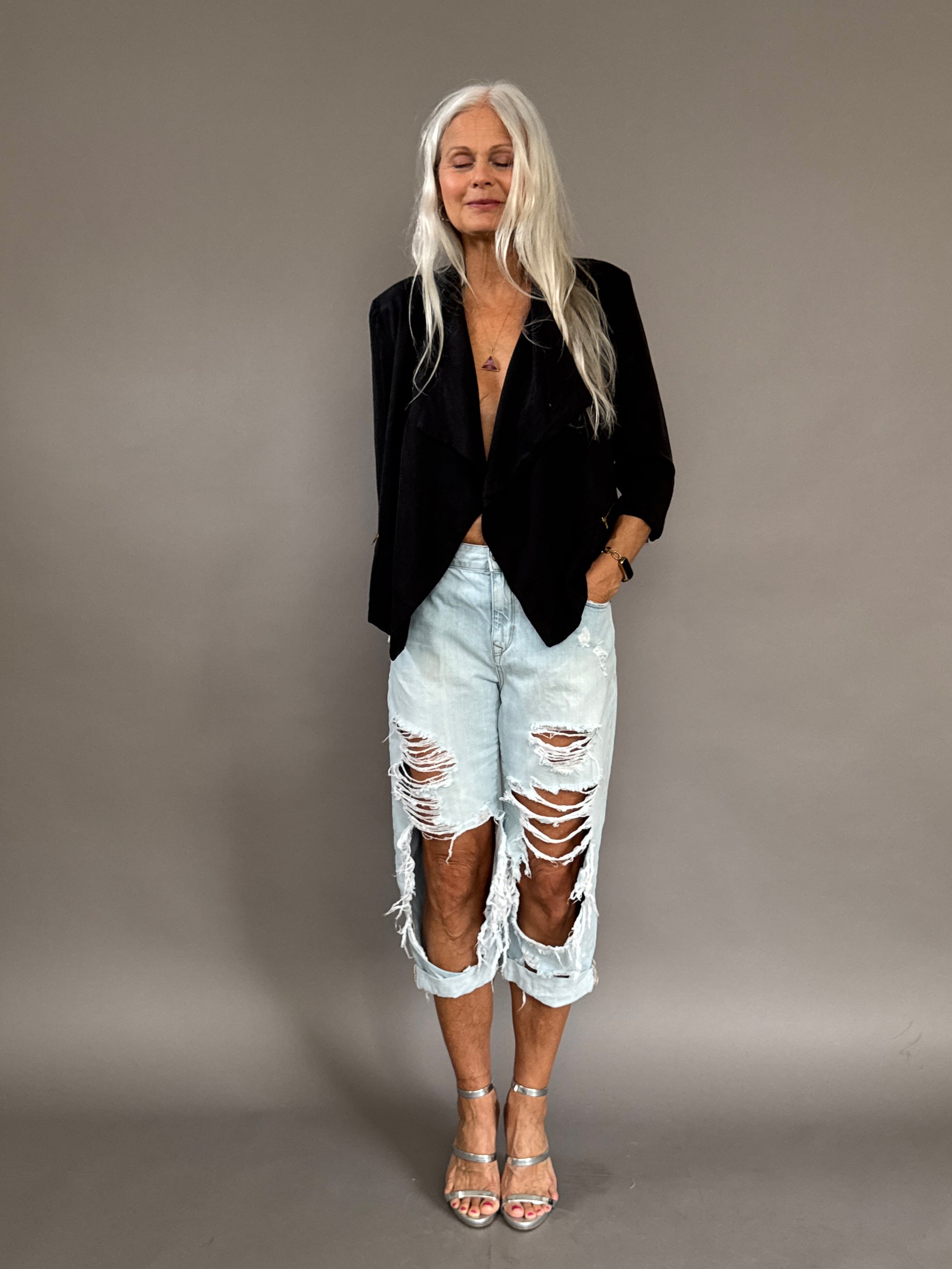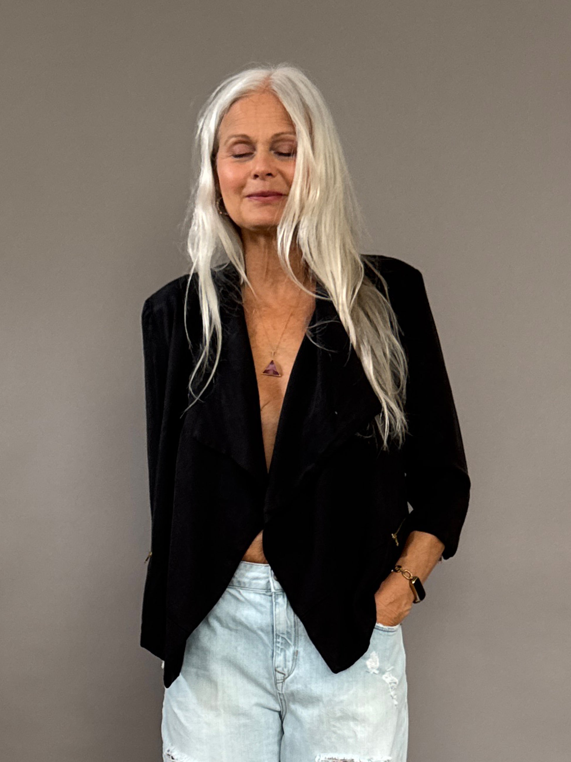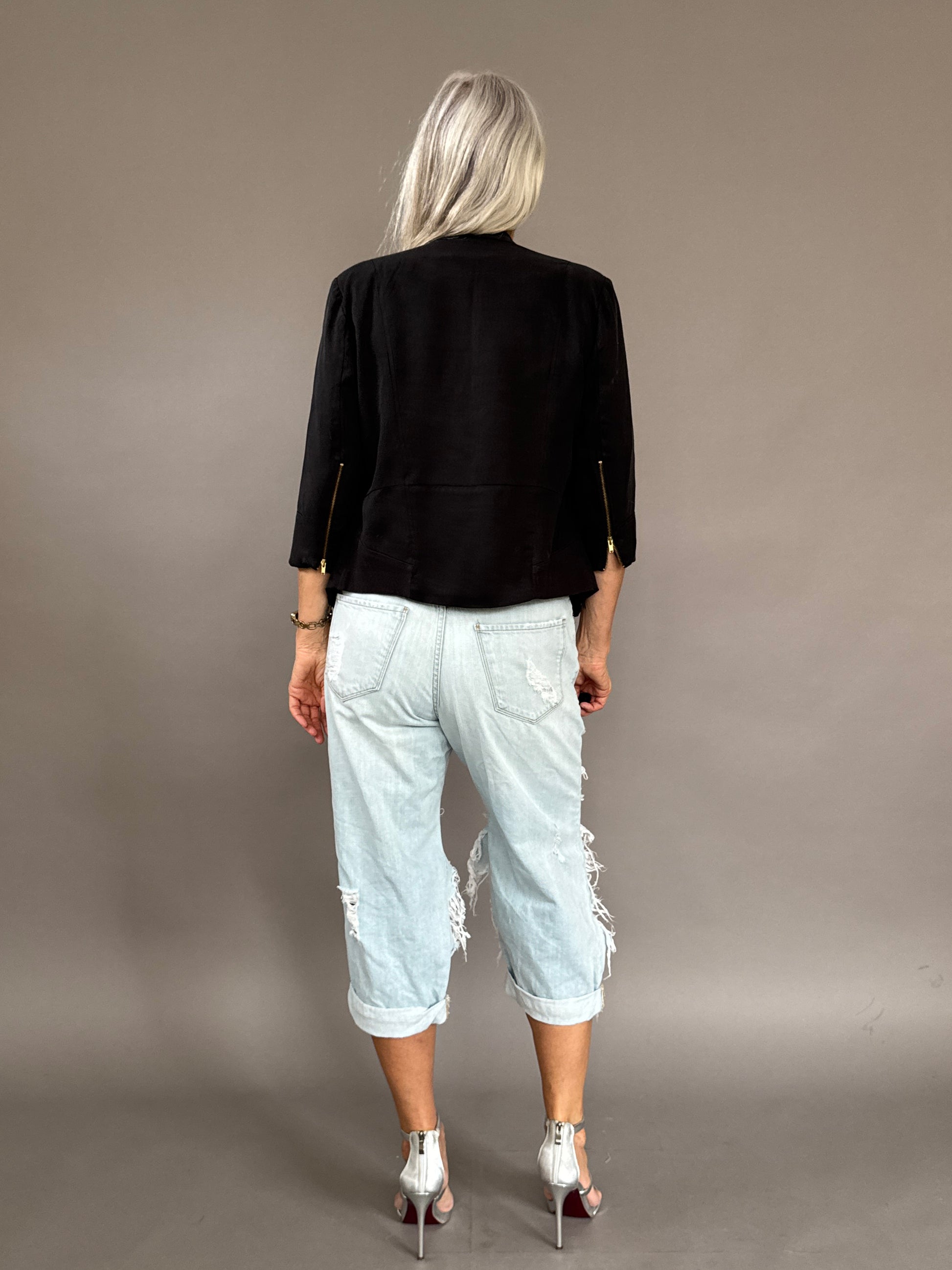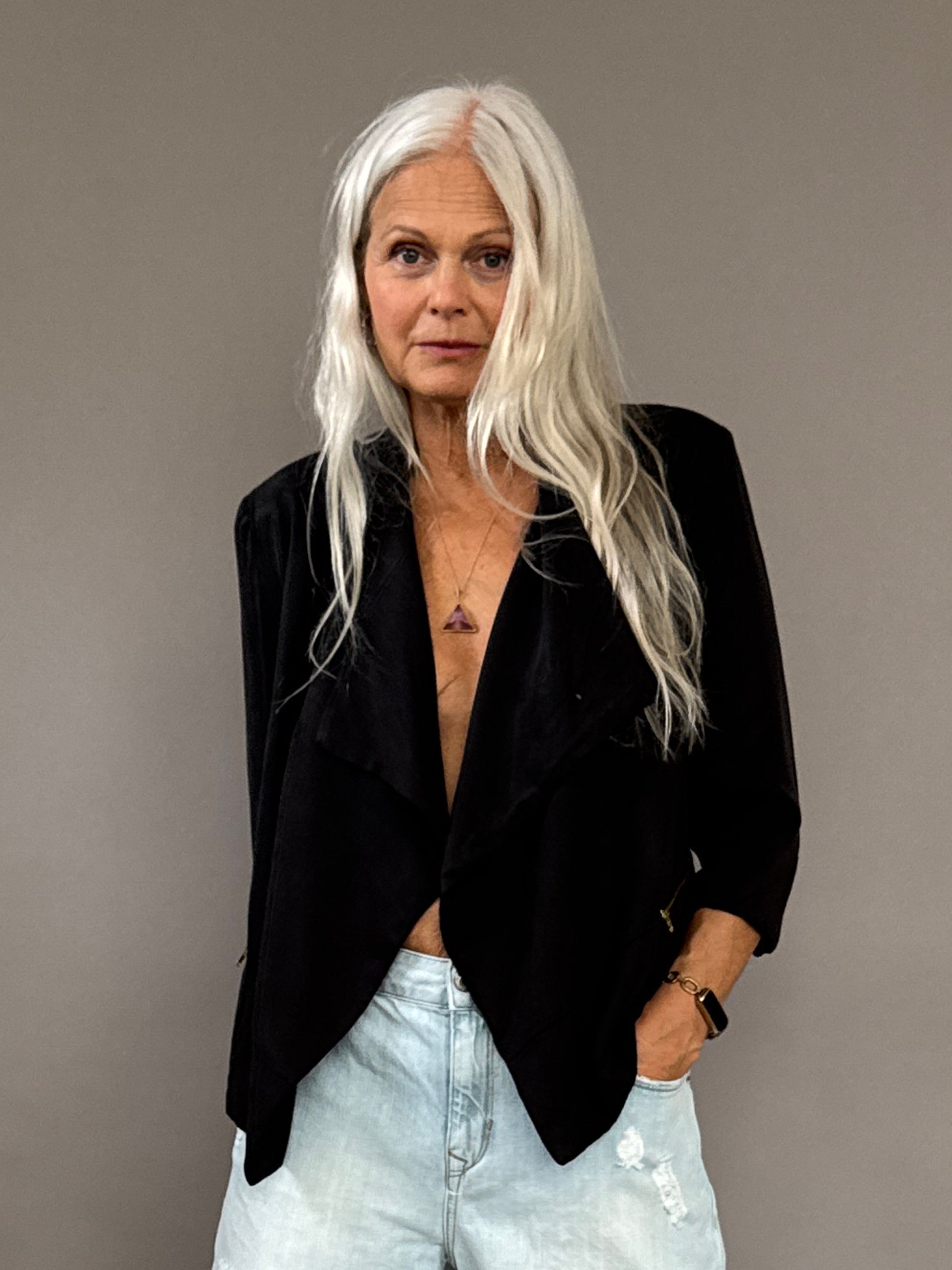 Black "dinner" jacket that is perfect to wear or bring on outings when its not too cold but you want something nice with you. Pockets and zipper details